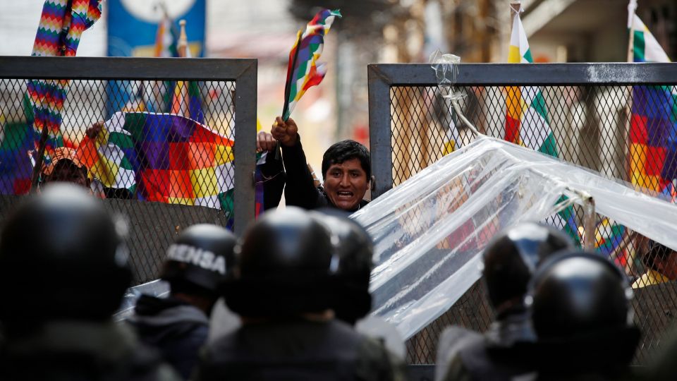 நவம்பர் 12, 2019, செவ்வாய்கிழமை, முன்னாள் ஜனாதிபதி இவொ மோராலெஸ் ஆதரவாளர்கள் பொலிவியாவின் La Paz மாநாட்டு பகுதியில் நுழைவதைப் பொலிஸ் தடுக்கிறது (படம்: அசோசியேடெட் பிரஸ்/ நடாசா பிசாரென்கொ)