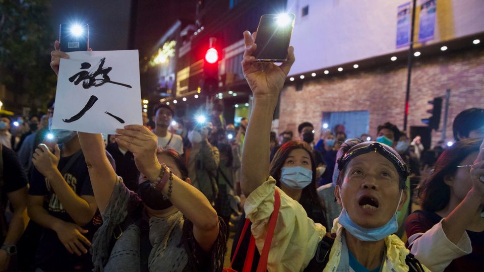 ஹாங்காங்கில் பிடிக்கப்பட்ட எஞ்சிய போராட்டக்காரர்களை விடுவிக்குமாறு அதிகாரிகளை வலியுறுத்துவதற்காக முகத்தை மறைத்த போராட்டக்காரர்கள் பாலிடெக்னிக் பல்கலைக்கழகத்திற்கு அருகில் ஒன்றுகூடி போது அவர்களின் ஸ்மார்ட்போன் வெளிச்சத்தைக் காட்டுகின்றனர். திங்கட்கிழமை, நவம்பர், 25, 2019. (படம்: அசோசியேடெட் பிரஸ்/ Ng Han Guan)