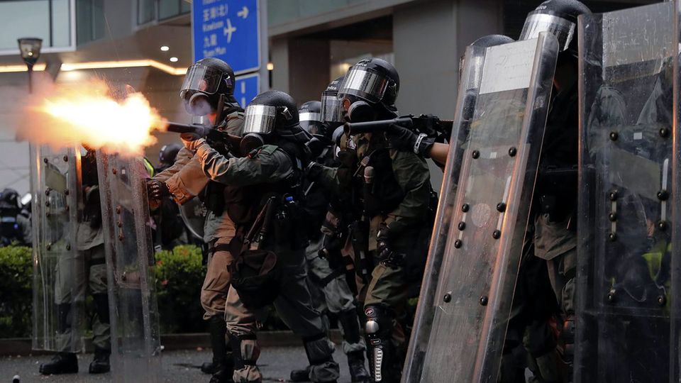 ஹாங் காங் போராட்டத்தின் போது கலகம் ஒடுக்கும் பொலிஸ் கண்ணீர் புகைக்குண்டுகளை வீசுகிறது, ஞாயிற்றுக்கிழமை, ஆகஸ்ட், 25, 2019. (படம்: அசோசியேடெட் பிரஸ்/ Kin Cheung)