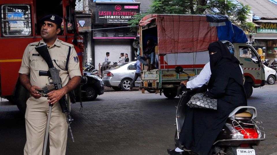 நவம்பர் 9, 2019, சனிக்கிழமை மும்பையில் ஒரு தெருவில் ஒரு பொலிஸ் அதிகாரி காவலில் ஈடுபட்டுள்ளார் (AP Photo / Rajanish Kakade)