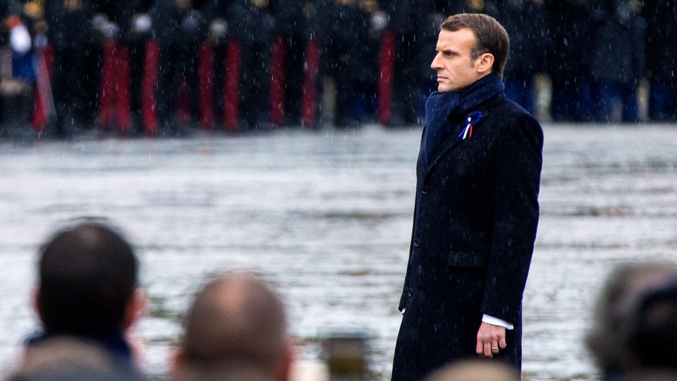 1918 போர் நிறுத்த உடன்படிக்கை நினைவு தினத்தில் தனியாக நிற்கும் இமானுவல் மக்ரோன் [படம்: விக்கிமீடியா, 2018]