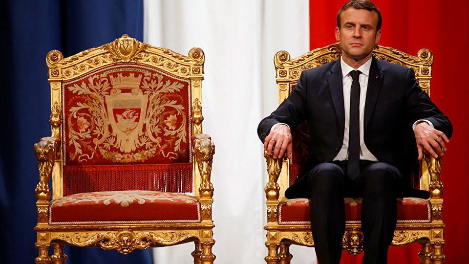 இமானுவல் மக்ரோன் அவரின் பதவி ஏற்பு விழாவின் போது பொன்மூலாம் பூசிய ஆசனத்தில் அமர்ந்துள்ளார் [படம்: விக்கிமீடியா]
