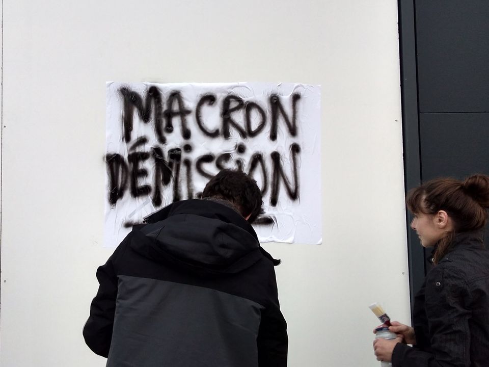 போராட்டக்காரர்கள் “மக்ரோன் இராஜினாமா செய்" என்று கோரும் போஸ்டரை ஒட்டுகிறார்கள்