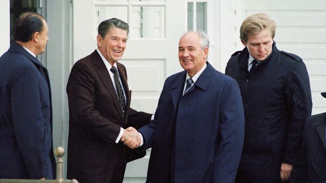 சோவியத் தலைவர் மிக்கையில் கோர்பச்சேவும் (வலதில் இருந்து இரண்டாவது) அமெரிக்க ஜனாதிபதி ரொனால்ட் ரீகனும் (இடதில் இருந்து இரண்டாவது) ஐஸ்லாந்து, Reykjavik இல் 1986 அக்டோபர் 11 அன்று ஒரு தொடர் பேச்சுவார்த்தையின் ஆரம்பத்தில் Hofdi க்கு வெளியில் கைகுலுக்குகின்றனர். (AP Photo/Ron Edmonds)