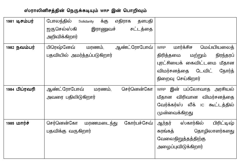 ஸ்ராலினிசத்தின் நெருக்கடி மற்றும் WRP இன் பொறிவைக் காட்டும் அட்டவணை