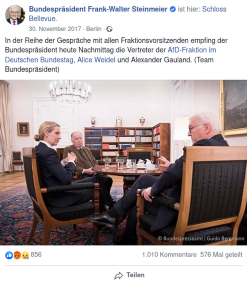 ஆனால், ஸ்ரைன்மையரில் இருந்து ஆளும் உயரடுக்கின் ஏனைய பிரதிநிதிகள் வரையில் பாசிசவாத அச்சுறுத்தல் குறித்த இவர்களின் எச்சரிக்கைகள் போலித்தனமானவையாகும். சமீபத்திய ஆண்டுகளில், அவர்கள் AfD இன் கிளர்ச்சியூட்டலையும் கொள்கைகளையும் அதிகரித்தளவில் அரவணைத்துள்ளனர், அவ்விதத்தில் அதன் வளர்ச்சிக்கு ஒத்துழைக்கும் சித்தாந்த சூழலையும் அரசியல் நிலைமைகளையும் உருவாக்கி உள்ளனர். இந்த நிகழ்வுபோக்கில் ஜேர்மனியின் அரசு தலைவர் ஒரு முக்கிய பாத்திரம் வகித்துள்ளார். 2017 தேசிய தேர்தலில் AfD தேர்தல் வெற்றி அடைந்து சிறிது காலத்திற்குப் பின்னர், அவர் குறிப்பிடுகையில், ஒருவர் அதிவலது கட்சியைச் சுற்றியுள்ள "சமரசப்படுத்தவியலா சுவர்களை" நீக்கி, “ஜேர்மன் தேசபற்றை" வளர்ச்சியடைய செய்ய வேண்டுமென குறிப்பிட்டார்.