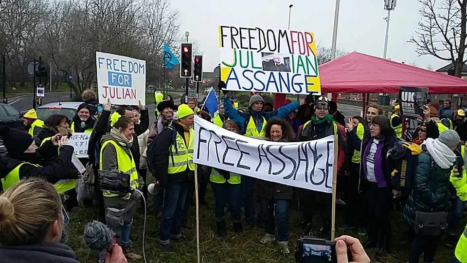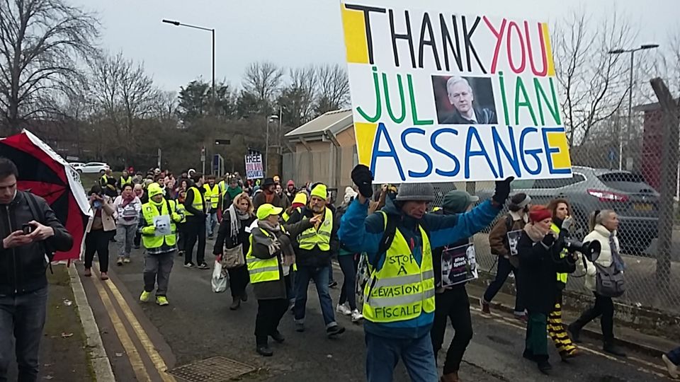 சிறையிலடைக்கப்பட்டுள்ள விக்கிலீக்ஸ் ஸ்தாபகரும் ஊடகவியலாளருமான ஜூலியன் அசான்ஜை பாதுகாக்க இலண்டனின் பெல்மார்ஷ் சிறைக்கு வெளியே நடந்த ஒரு ஆர்ப்பாட்டத்தில் கலந்துகொள்ள நூறுக்கும் அதிகமான “மஞ்சள் சீருடை” ஆர்ப்பாட்டக்காரர்கள் சனியன்று பிரான்சிலிருந்து பயணித்தனர்.