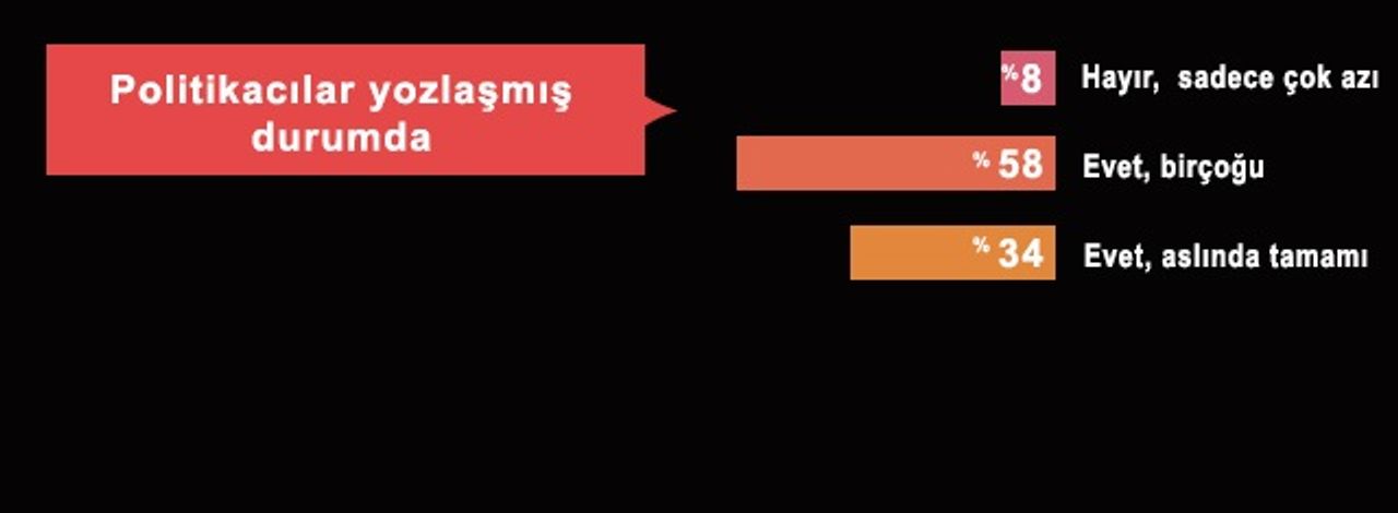 “Politikacılar yozlaşmış durumda mı?” sorusu sorulduğunda, yanıtlayanlar, daha kesin bir tavır içindeydi. Onların sadece yüzde 8’i “Hayır, sadece çok azı” yanıtı verirken, ezici çoğunluk ya “birçoğu” ya da “aslında tamamı” yanıtı vererek, “evet” dedi.