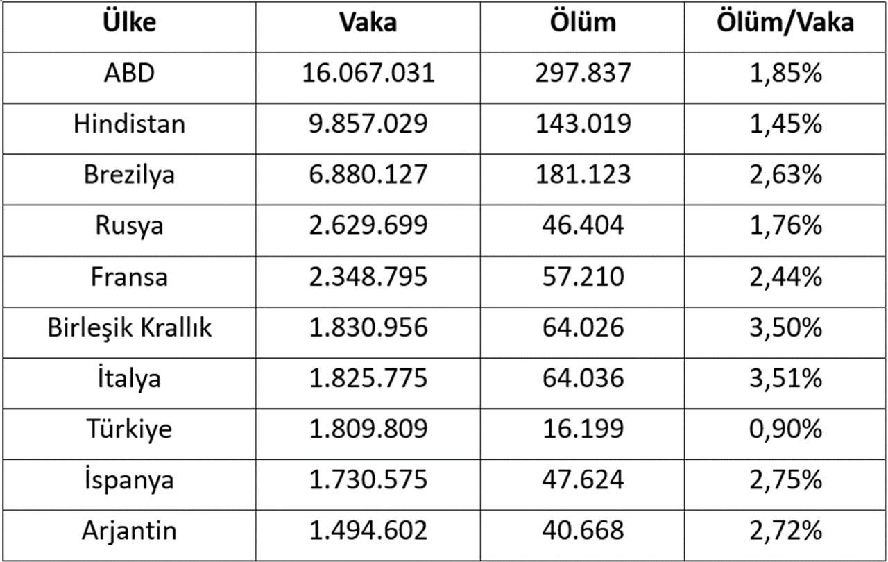 Günlük yaklaşık 30.000 vaka ile Türkiye, Amerika Birleşik Devletleri ve Brezilya’dan sonra dünyada üçüncü sırada ve şu anda Avrupa’da ilk sıraya yükselmiş durumda. Son süreçte açıklanan günlük 200’ü aşkın ölüm sayısı, Türkiye’de ilk vakanın tespit edildiği 11 Mart’tan bu yana en yüksek seviyeyi temsil ediyor.